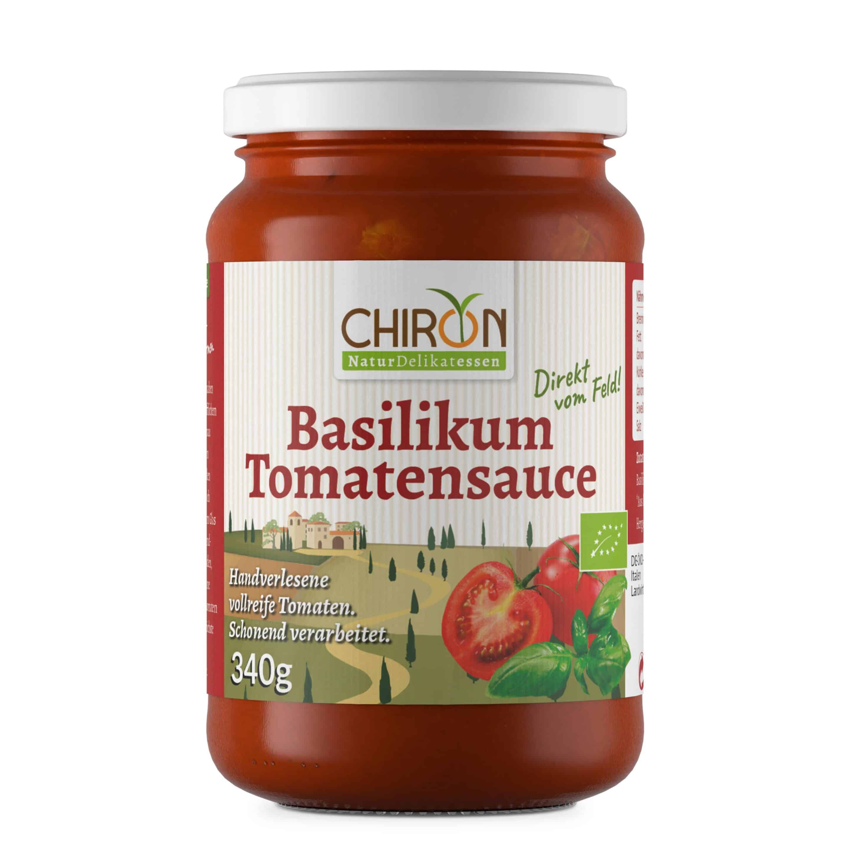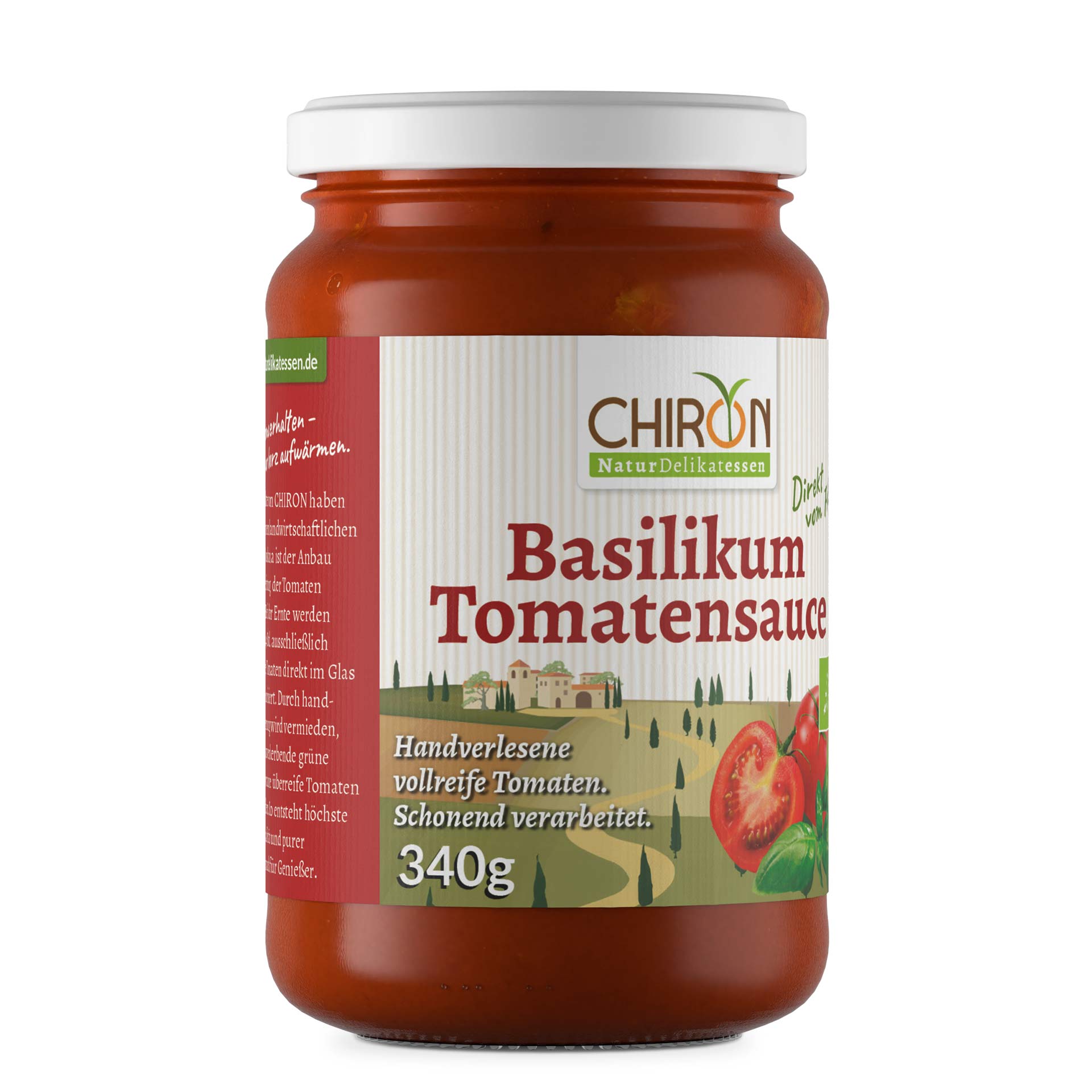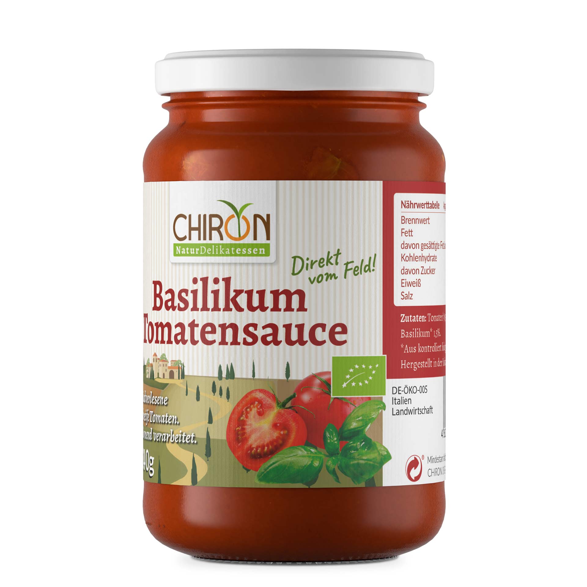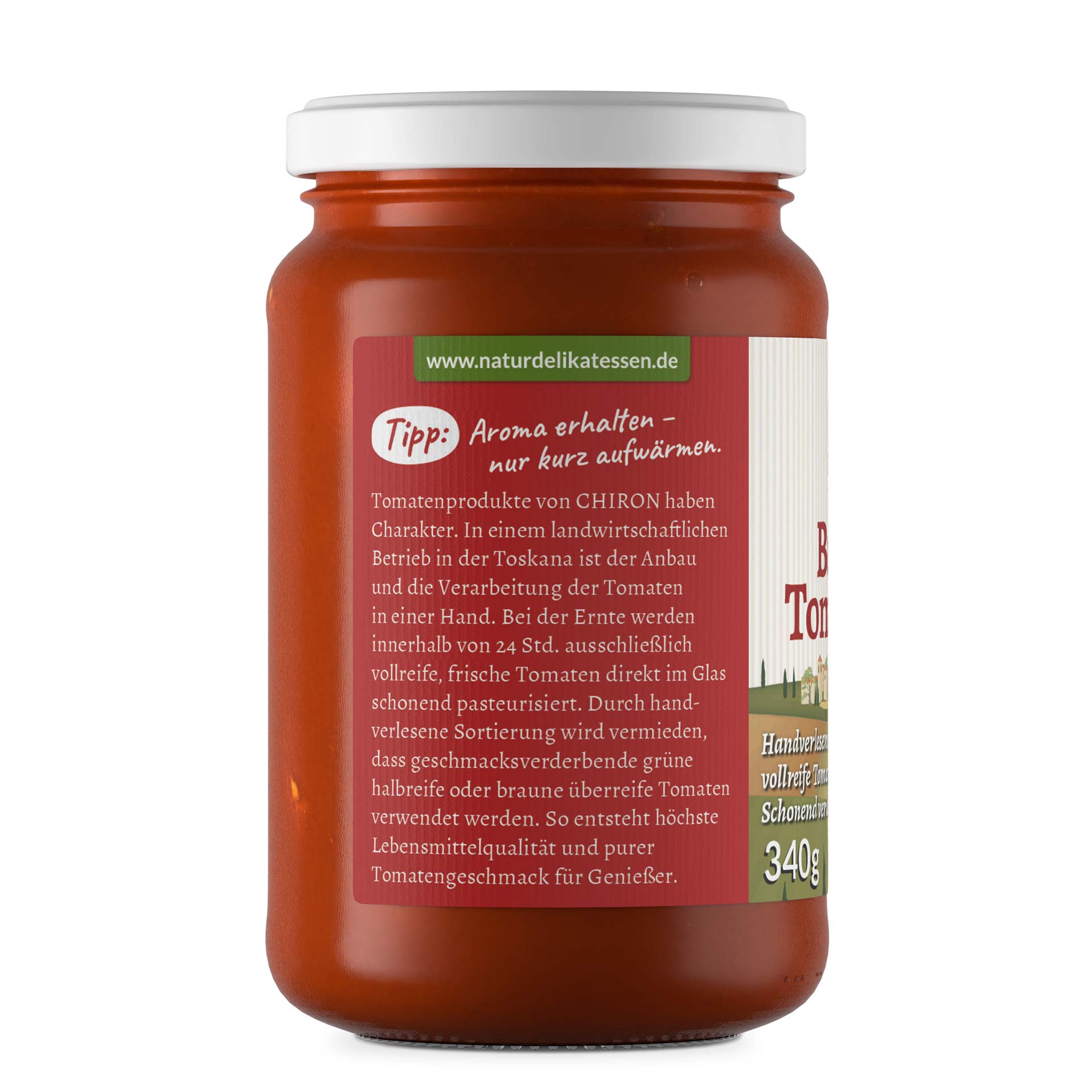 Diese Tomaten-Basilikumsauce mit 98,5 % Tomaten erhält frische Basilikumblätter ins Glas. So durchzieht ein feiner Basilikumgeschmack die Tomatensauce.