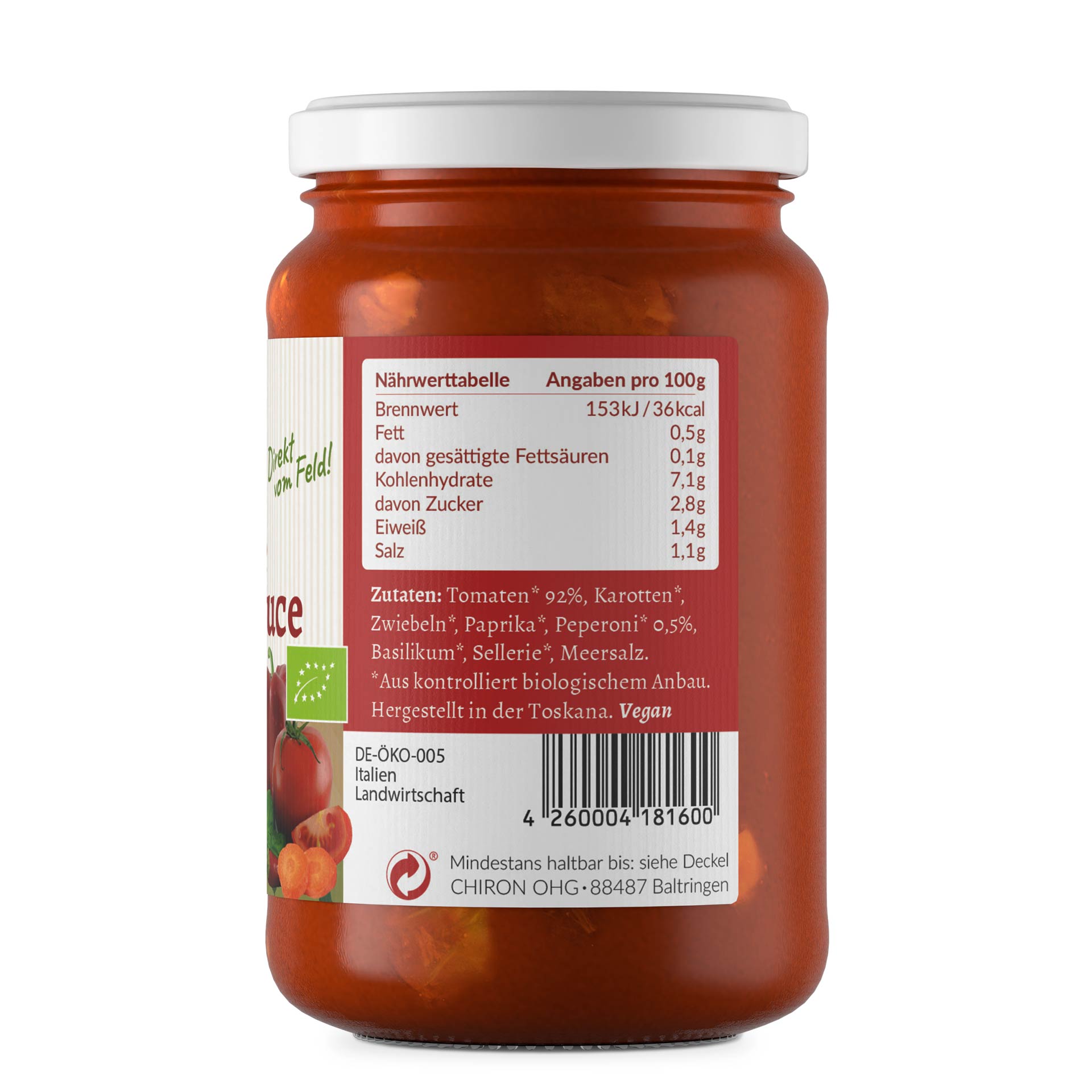 Tomaten* 92%, Karotten*, Zwiebeln*, Paprika*, Peperoni* 0,5%, Basilikum*, Sellerie*, Meersalz.