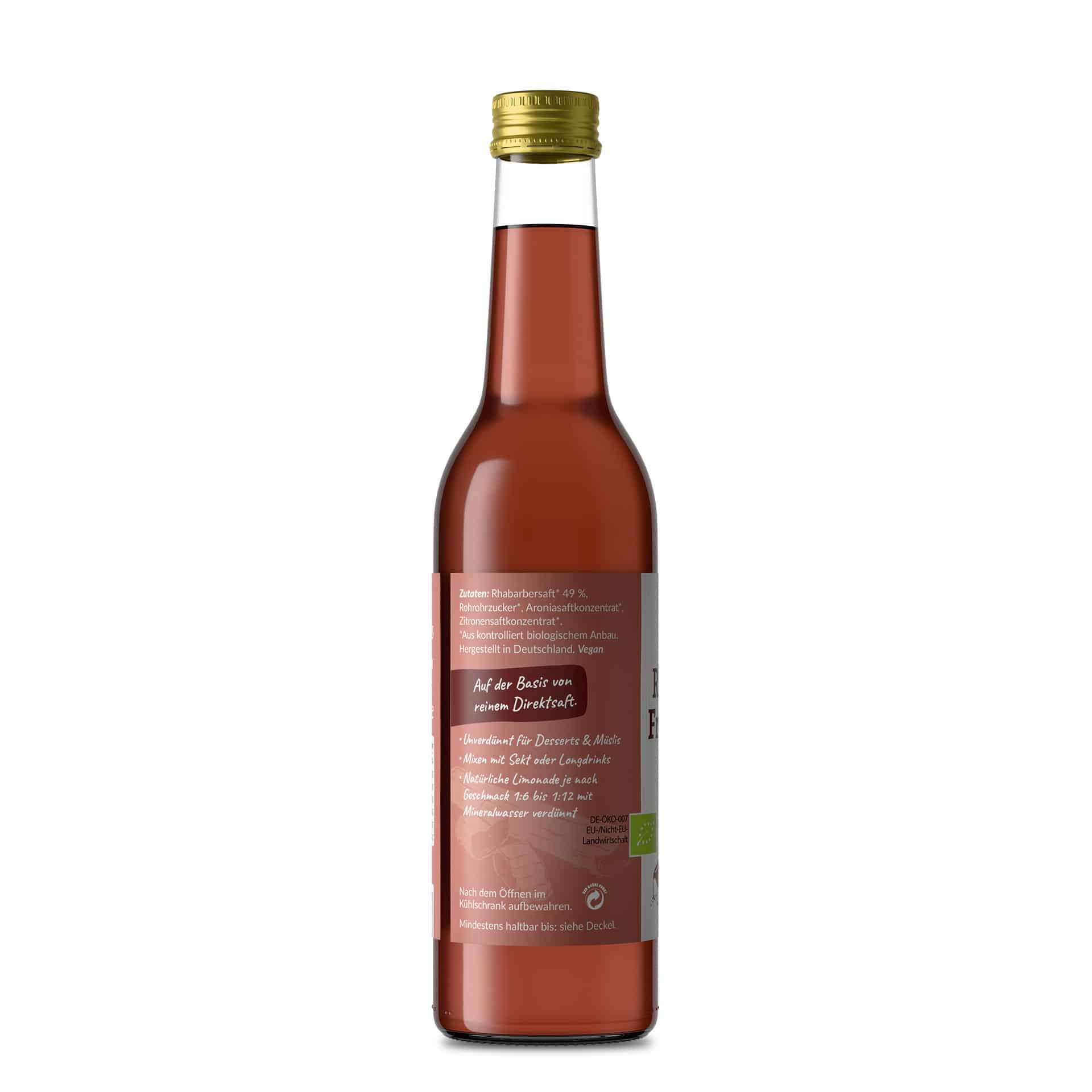 Rhabarbersaft * 49%, Rohrohrzucker*, Aroniasaftkonzentrat*, Zitronensaftkonzentrat*. *Aus kontrolliert biologischem Anbau. Hergestellt in Deutschland.Vegan
