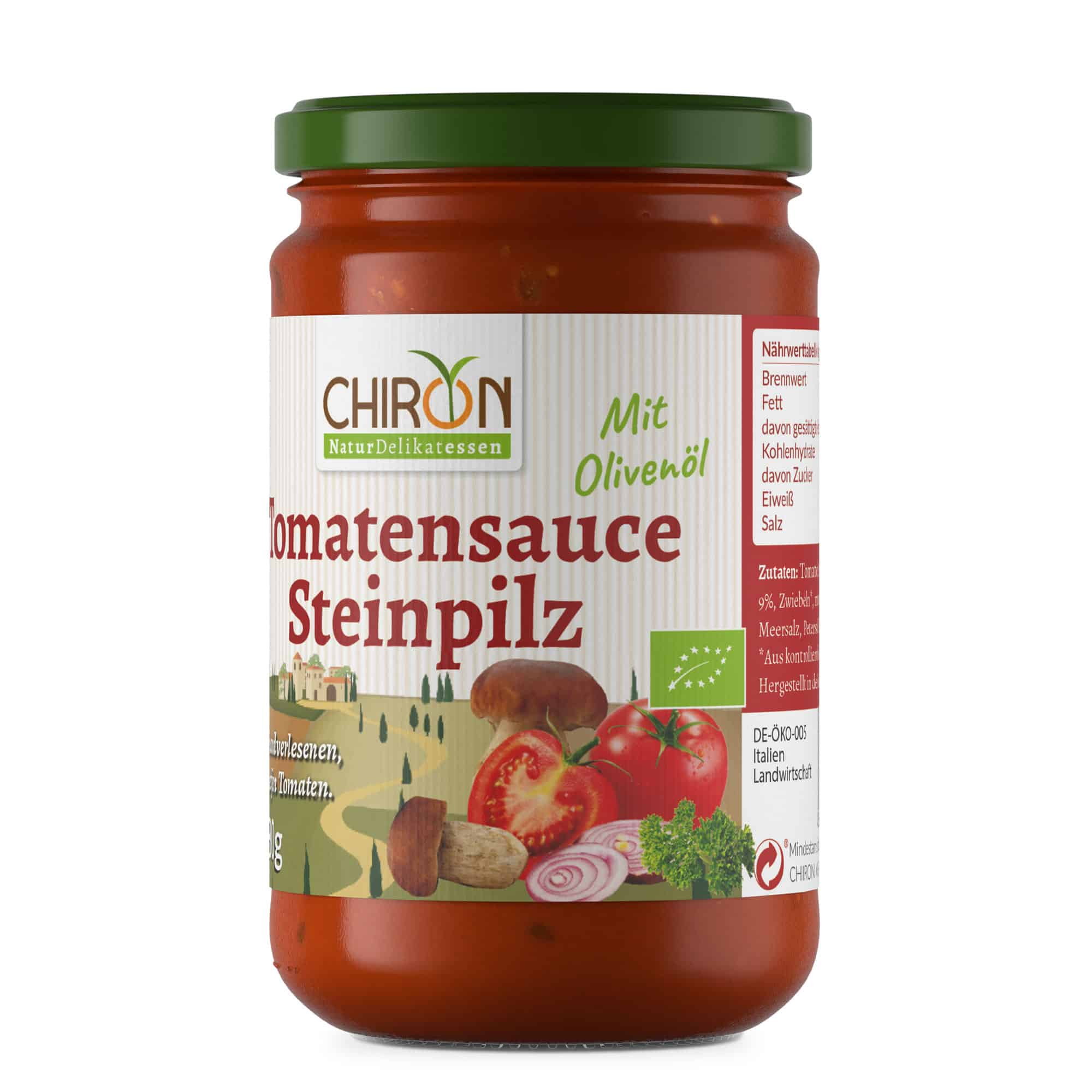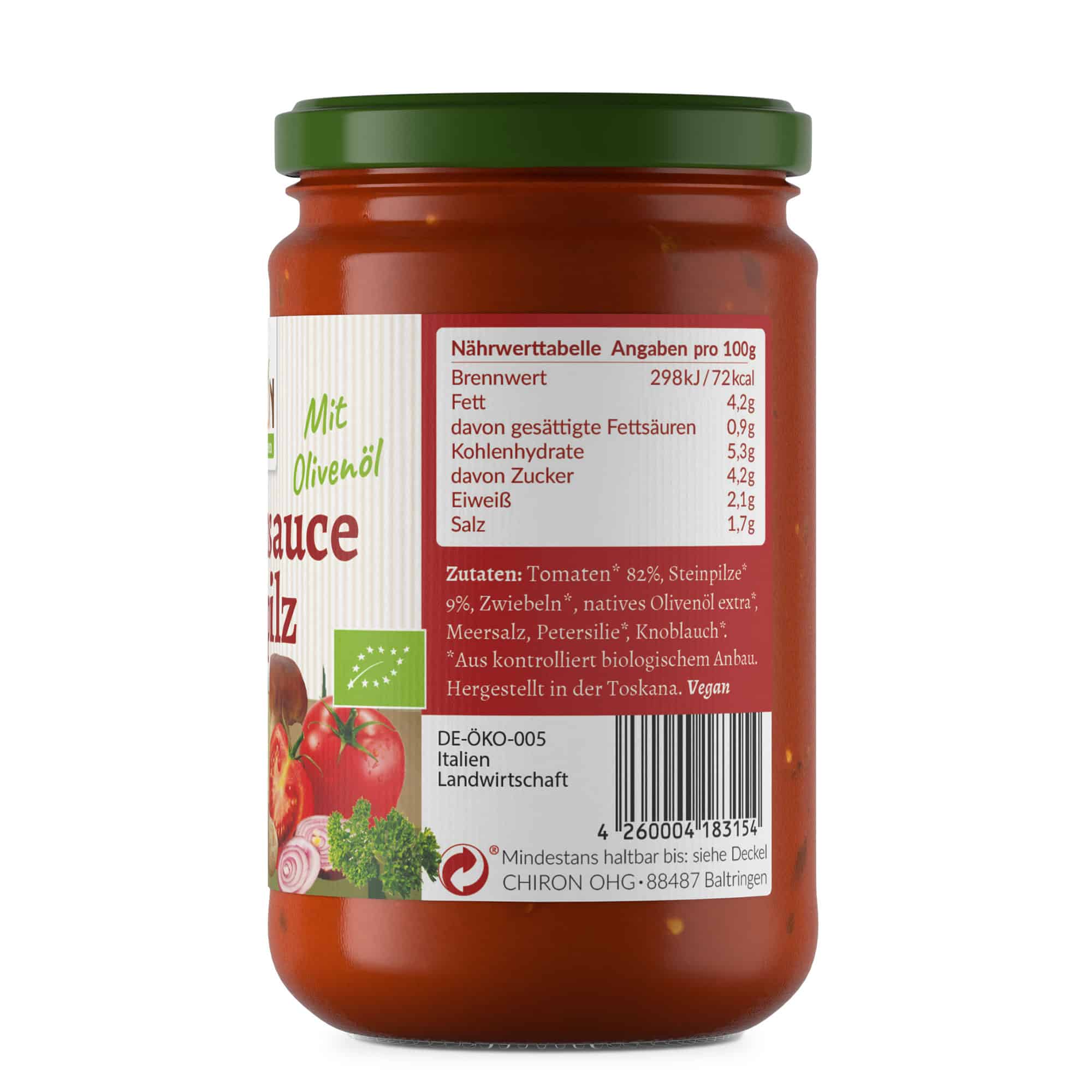 Tomaten* 82%, Steinpilze* 9%, Zwiebeln*, natives Olivenöl*, Meersalz, Petersilie*, Knoblauch*