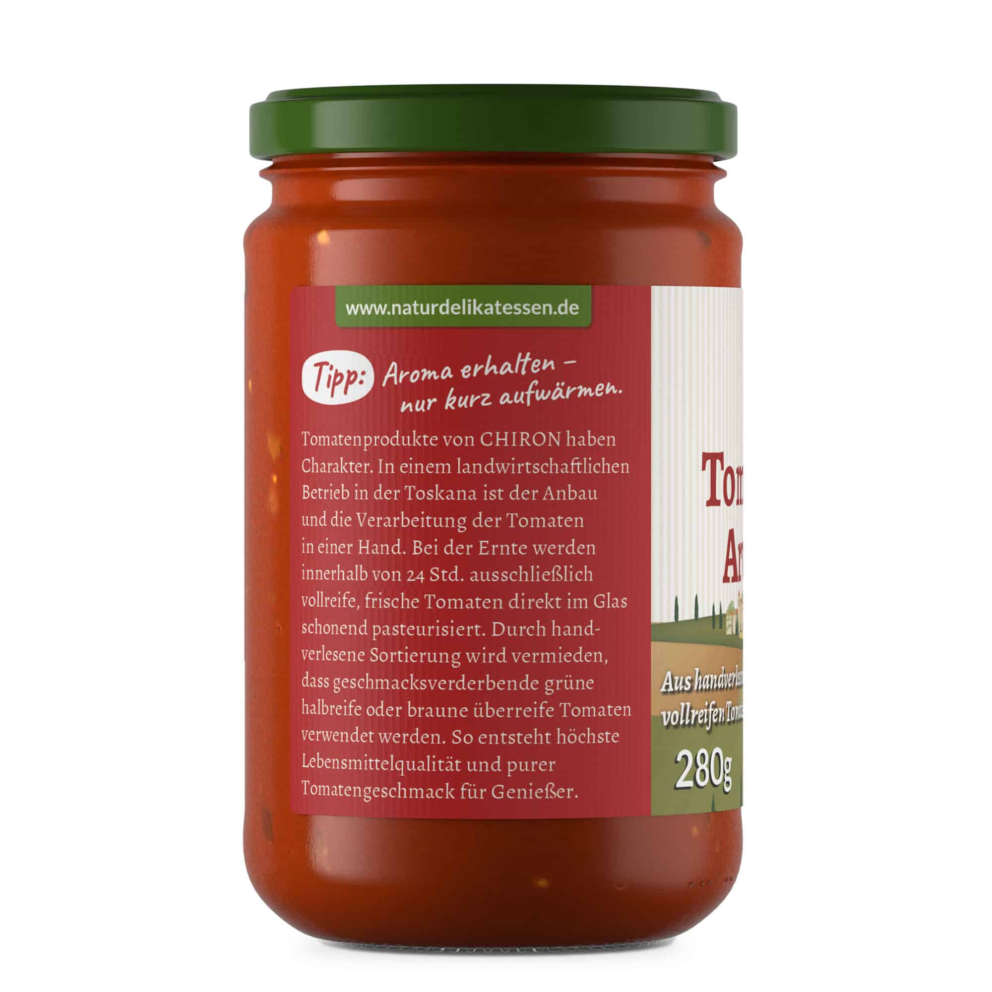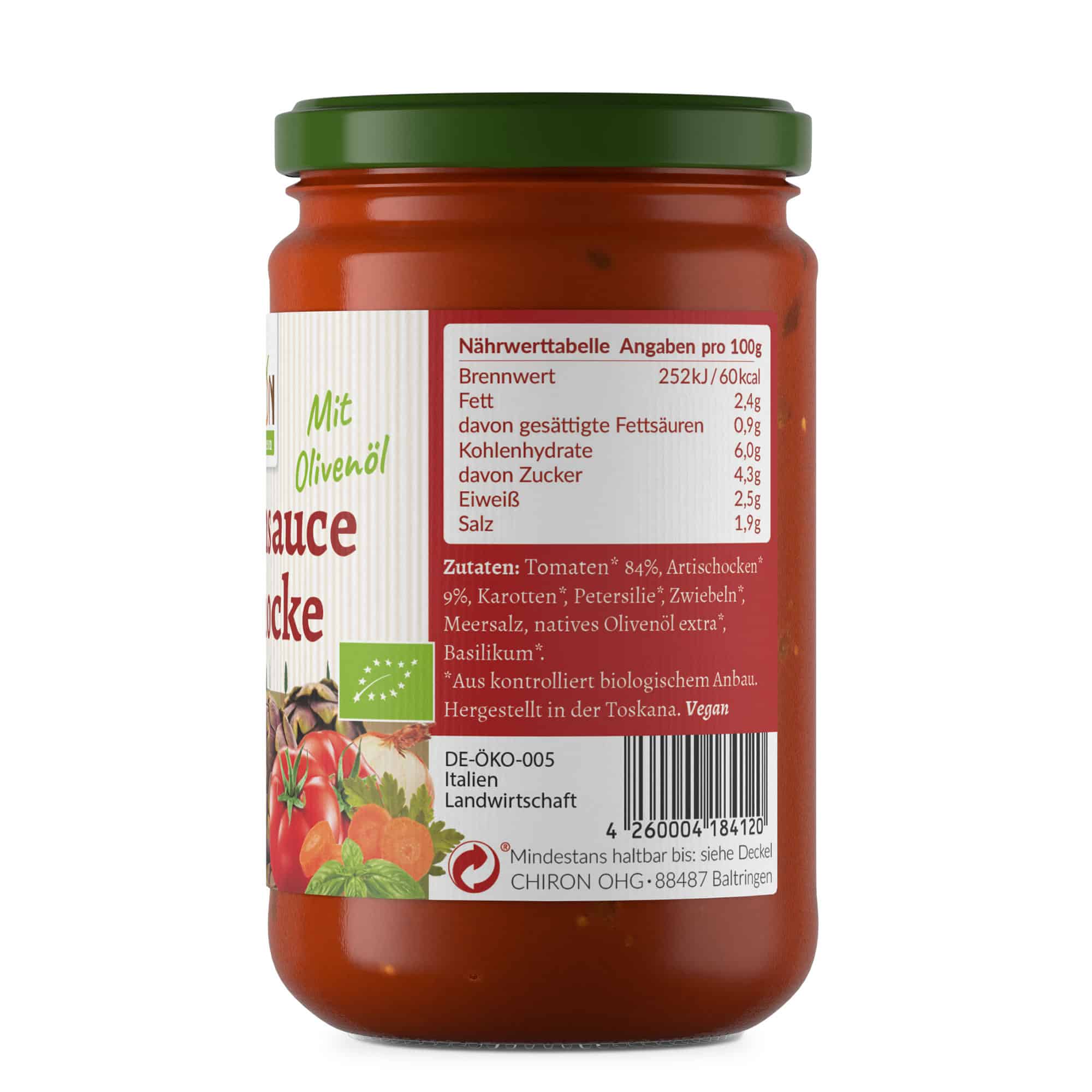 Zutaten: Tomaten* 84%, Artischocken* 9%, Karotten*, Petersilie*, Zwiebeln*, Meersalz, natives Olivenöl extra*, Basilikum* *Aus kontrolliert biologischem AnbauHergestellt in der Toskana.Vegan