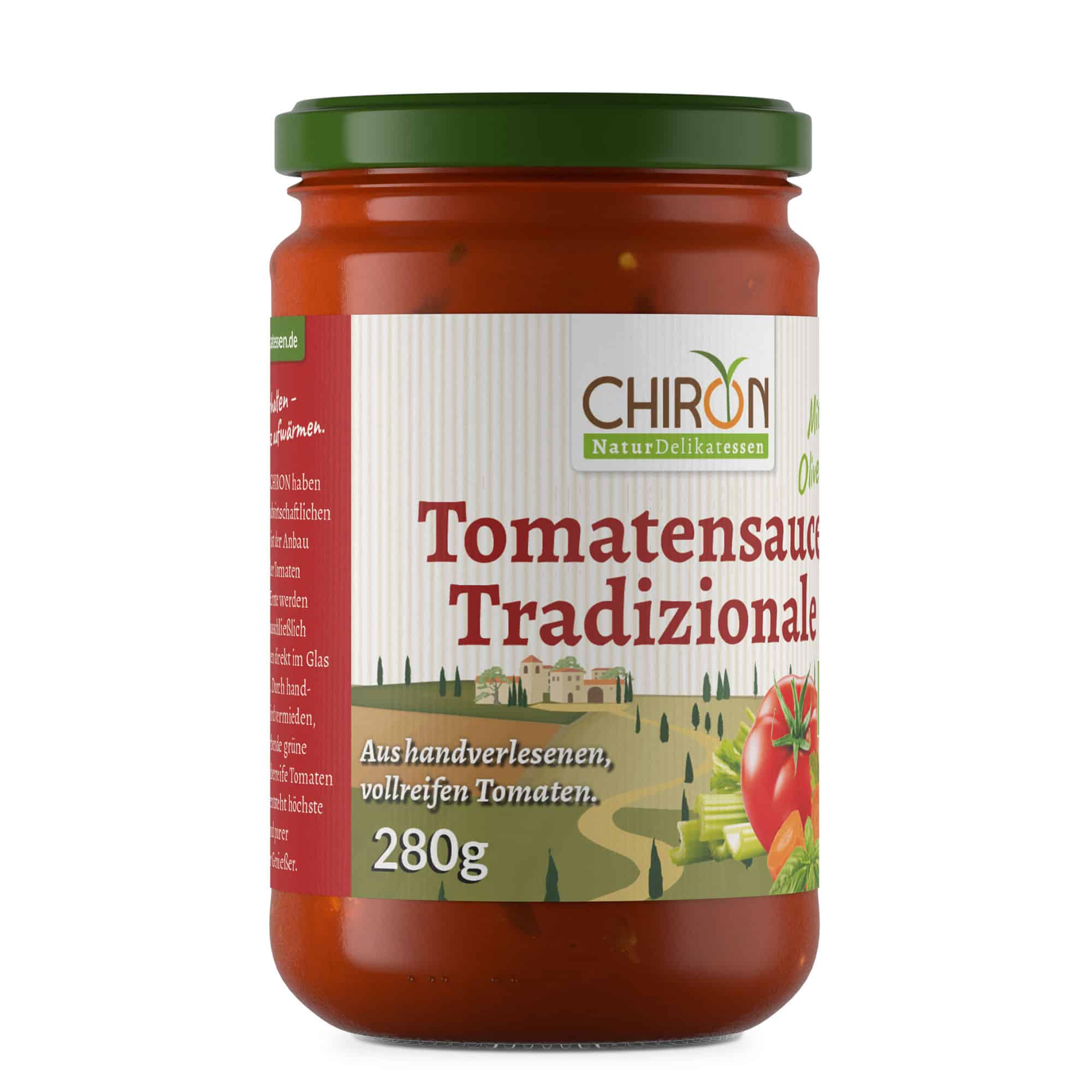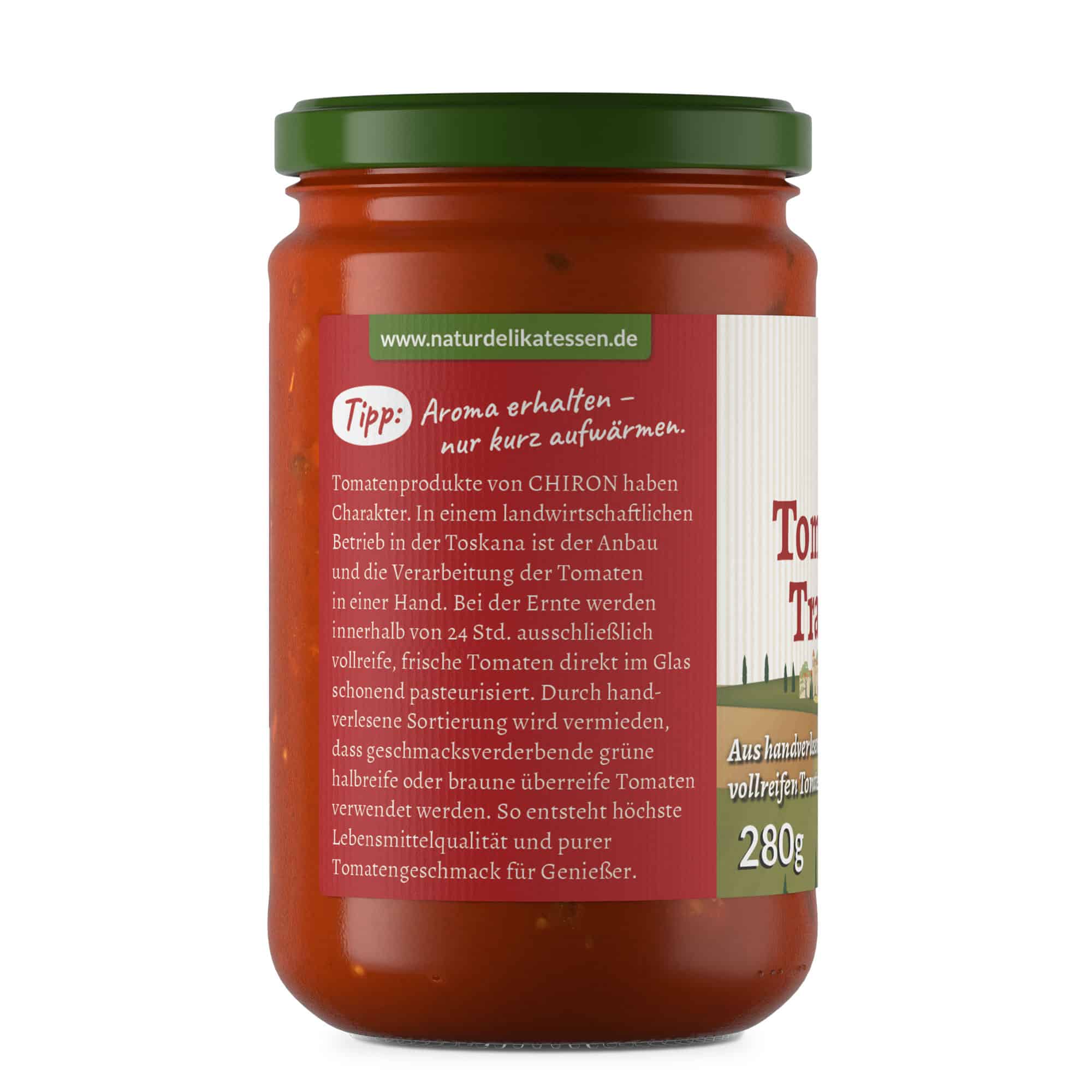 Tomatenprodukte von CHIRON in Bio-Qualität sind Lebensmittel mit Charakter. In einem landwirtschaftlichen Betrieb in der Toskana ist der Anbau und die Verarbeitung der Tomaten in einer Hand. Innerhalb 24 Std. nach der Ernte werden ausschließlich vollreife, frische Tomaten direkt im Glas schonend pasteurisiert. Durch handverlesene Sortierung bei der Verarbeitung wird vermieden, dass geschmacksverderbende grüne halbreife oder braune überreife Tomaten verwendet werden. So entsteht höchste Lebensmittelqualität und purer Tomatengeschmack für Feinschmecker.