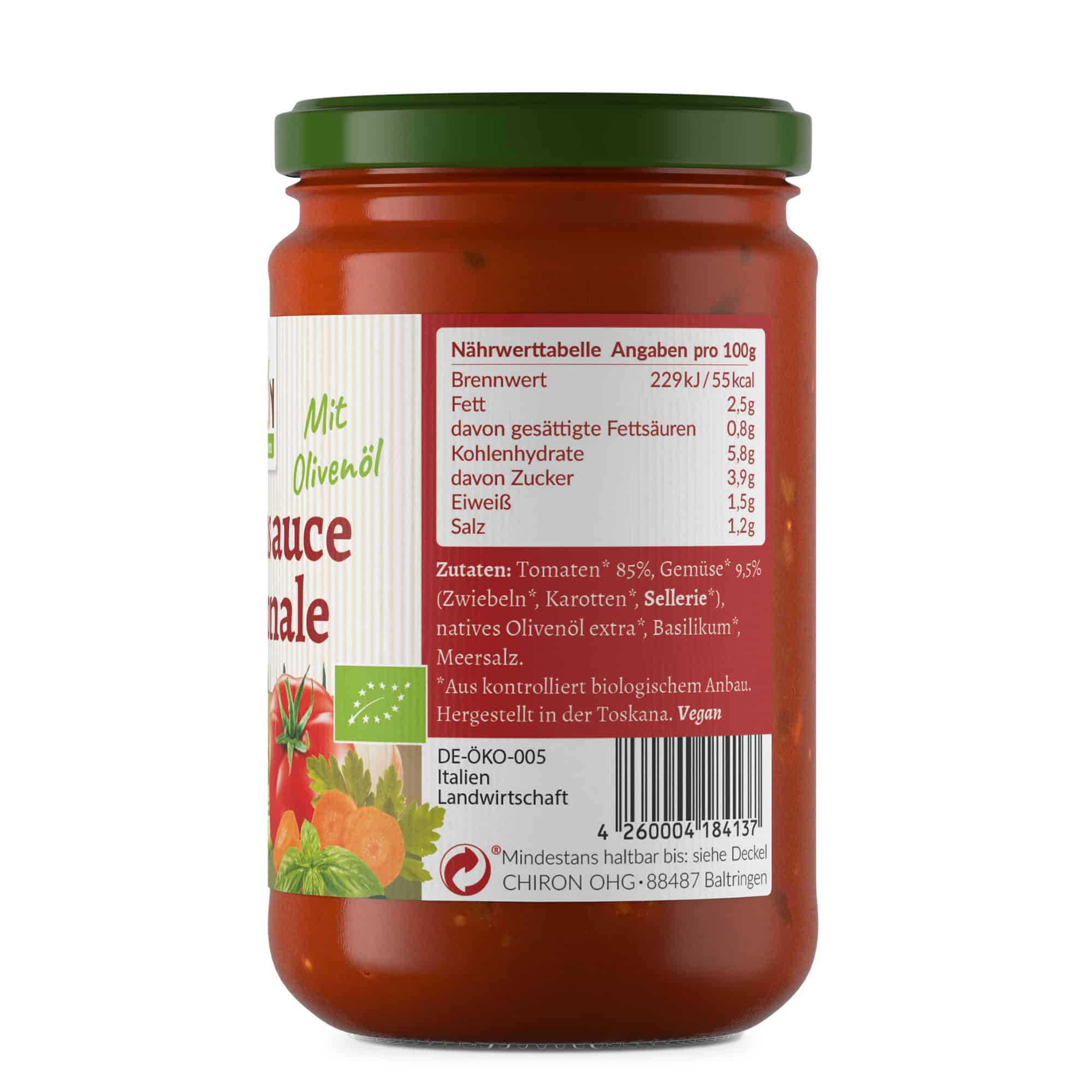 Zutaten: Tomaten* 85%, Gemüse* 9,5%, (Zwiebeln*, Karotten*, Sellerie*), natives Olivenöl extra*, Basilikum*, Meersalz.